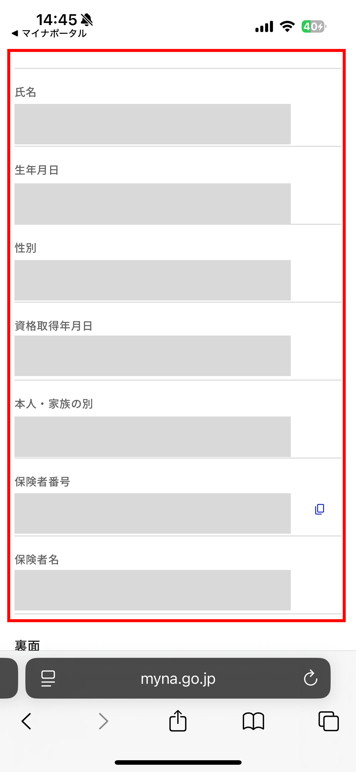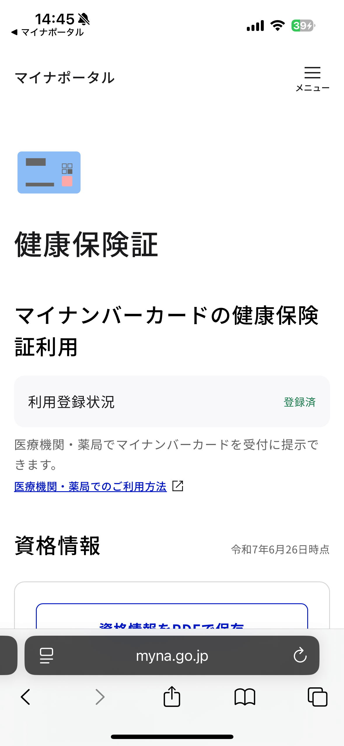 資格情報までスクロールし、保険証情報のスクリーンショットを2枚撮影します。