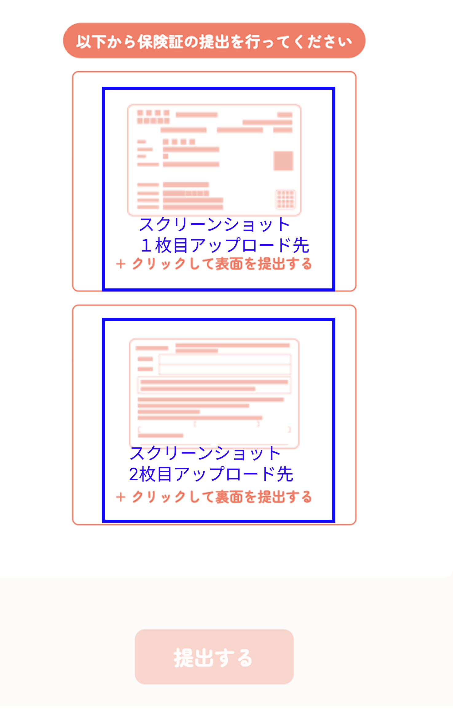 以下の保険証表面提出に1枚目を、保険証裏面提出に2枚目をアップロードしてください。